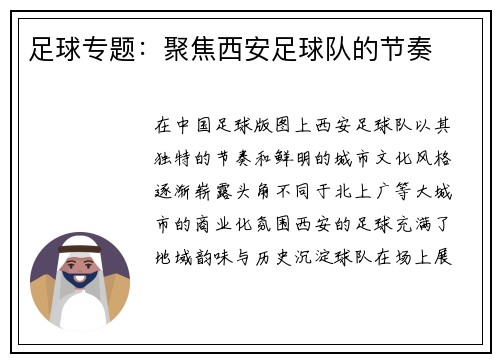 西安足球队的节奏不仅仅是比赛中的快慢变化,它更是一种整体的团队氛围、一种战术理念的体现,以及球员心理素质和球迷文化的综合呈现。在接下来的发展中,这种节奏感将成为球队最大的竞争力,也将逐渐塑造西安在中国足球版图上的独特位置。